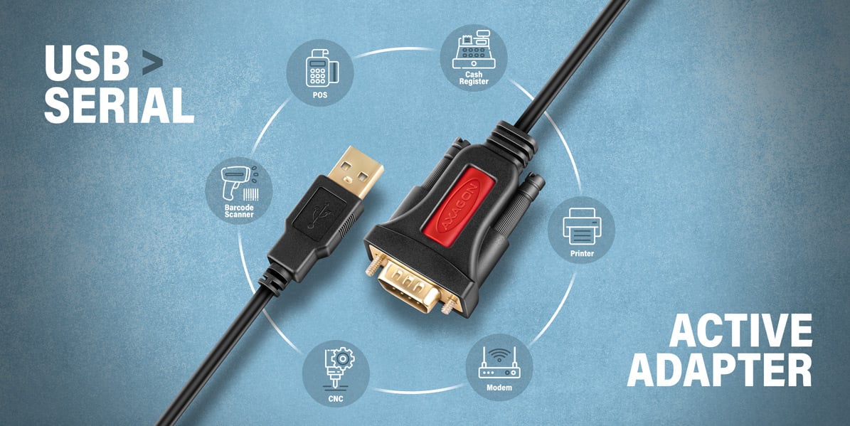 The active USB converter AXAGON ADS-1PSN easily expands the computer with a serial port of the RS 232 standard.