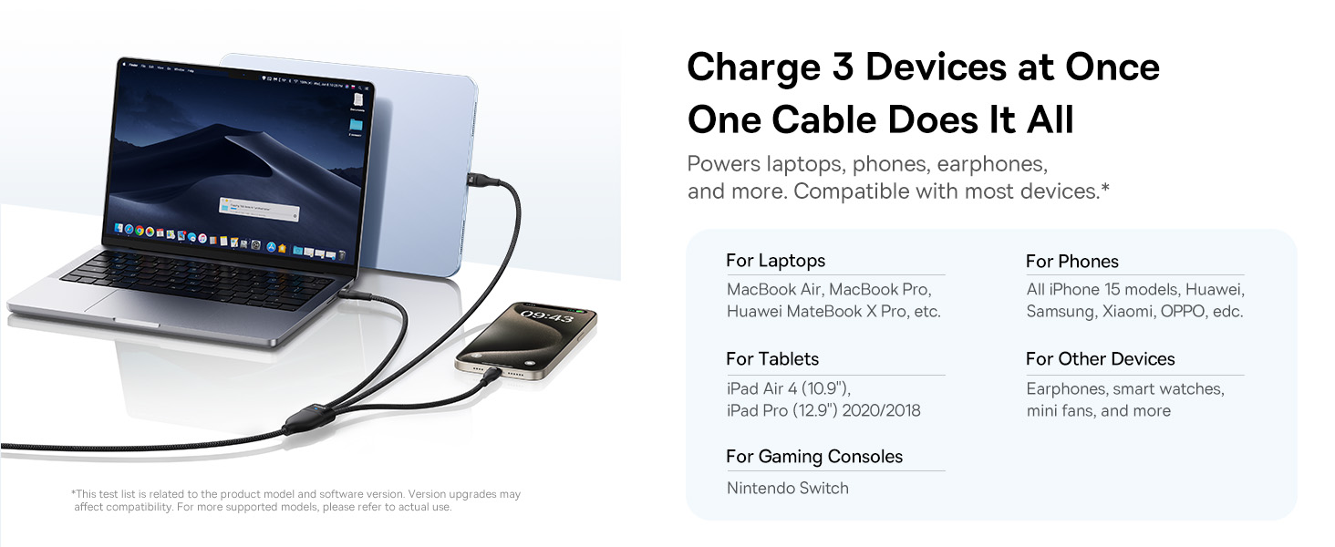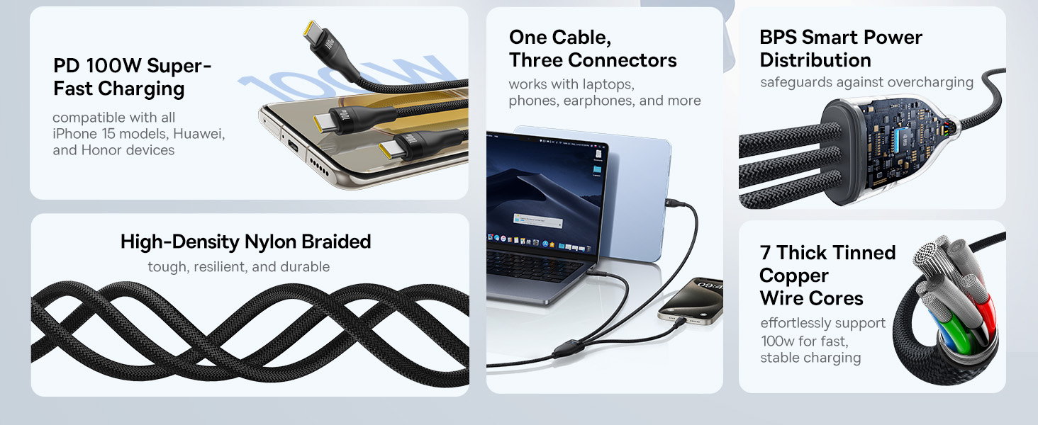 Дизайн „One-for-Three“ – Type-C към C+C+C за едновременно зареждане на три устройства.