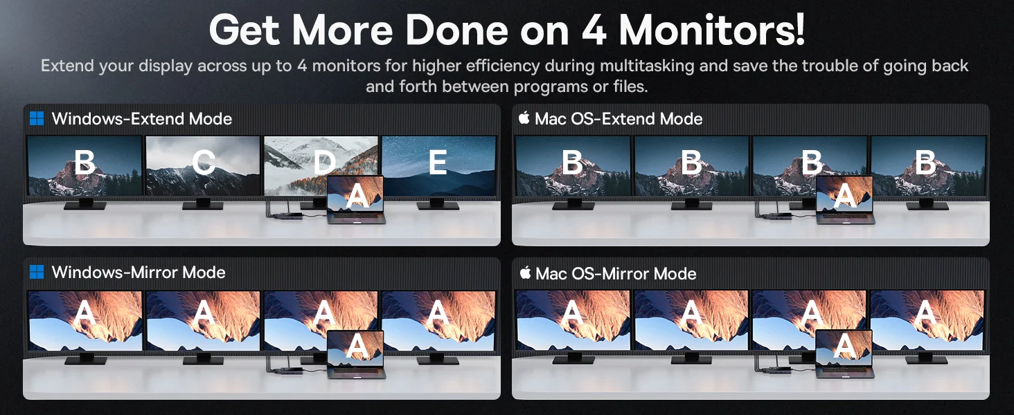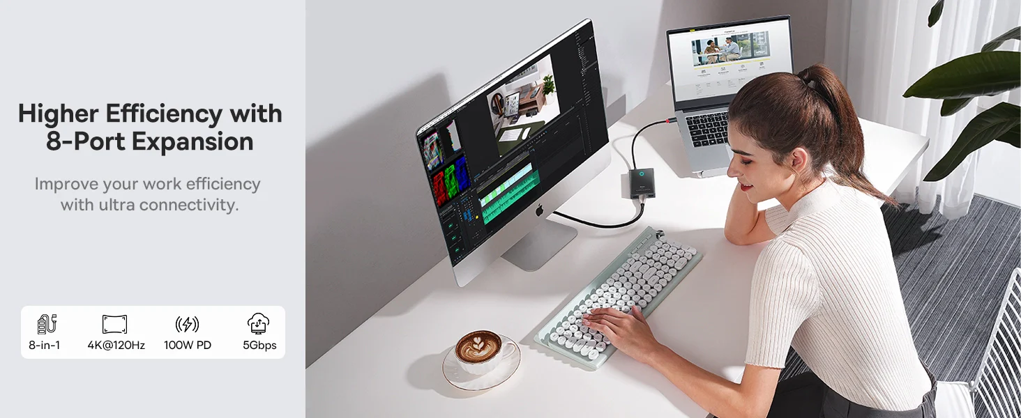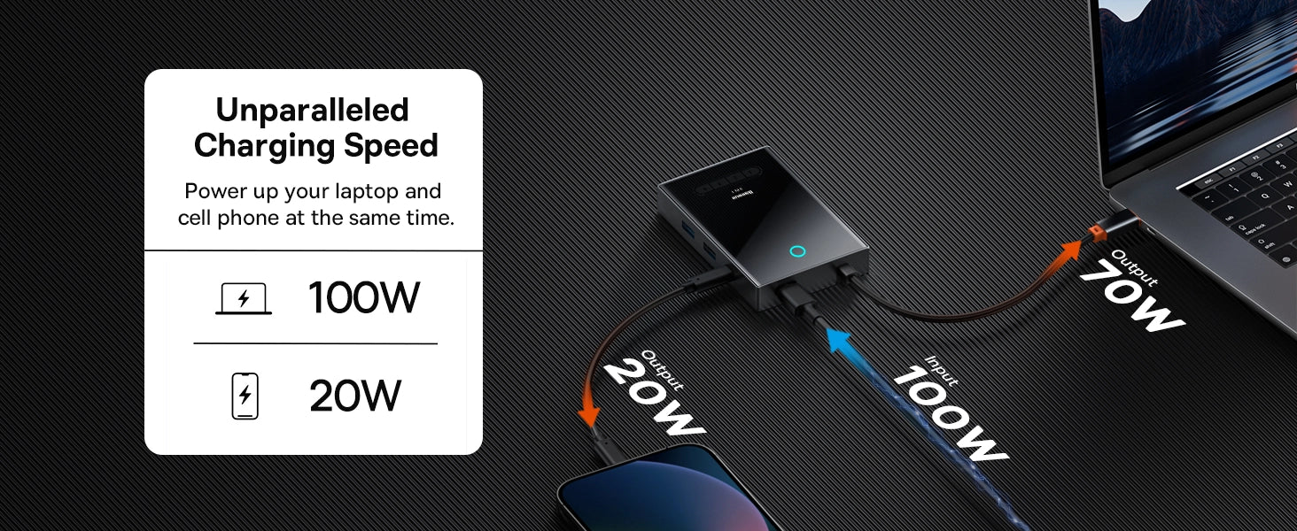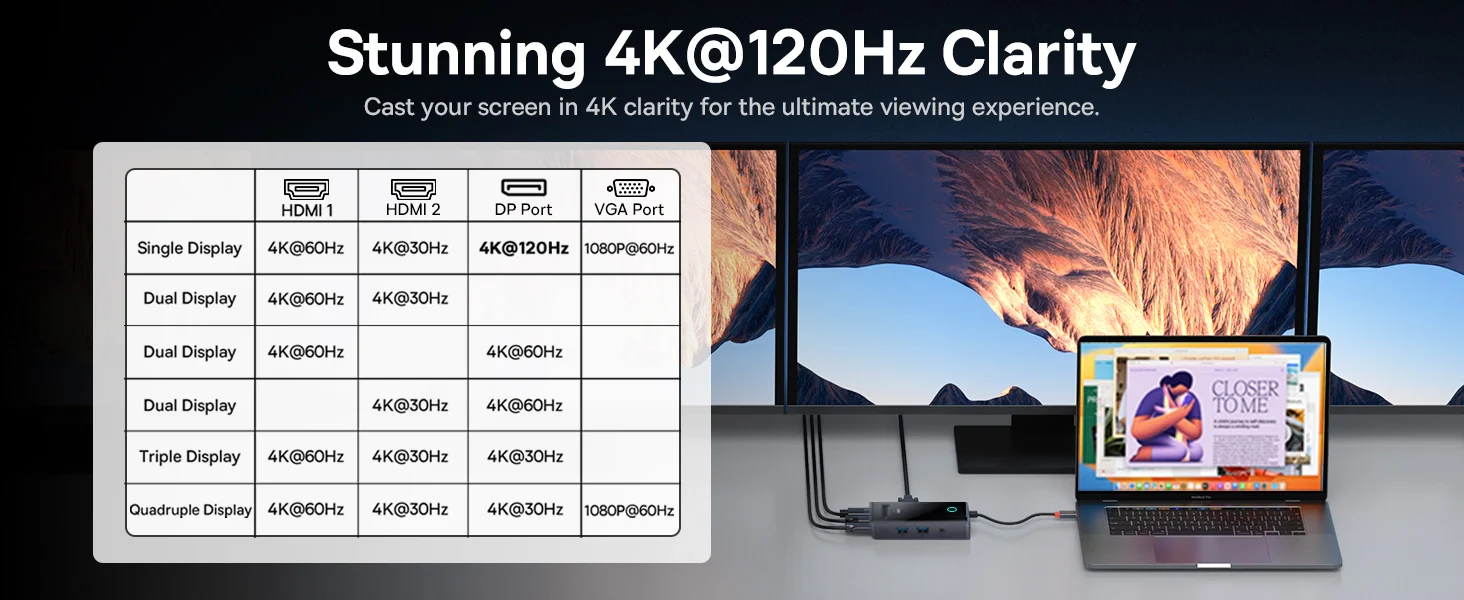 Revolutionize connectivity with Baseus 8-in-1 Docking Station — 4 display ports (2 HDMI, 1 DP, 1 VGA) at max 4K@120Hz. With just a Single Tap of the button, the connected Display will be switched off and protect your privacy. Compatible with laptops, tablets, and mobile.