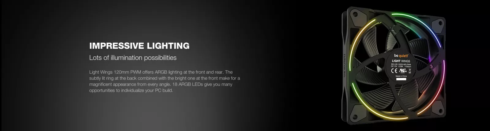 A highly optimized impeller achieves the silent operation be quiet! is famous for. With a noise level of 20.6dB(A) at maximum fan speed, it proves that instead of being a replacement the lighting is an addon to very silent and powerful operation. All features combine to make Light Wings 120mm PWM the fan of choice for silent show cases and gaming systems alike.