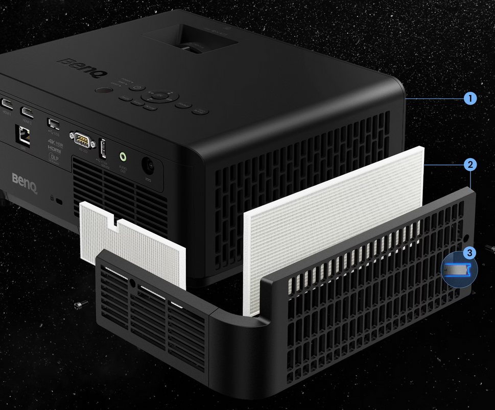 1 IP6X Sealed Engine Design for Dust-Prone Environments Shields the projector’s optical engine from dust intrusion, ensuring long-term stability and reliable performance in harsh, dust-prone environments such as exhibition halls, factory spaces, and training centers. | 2 Optional Filter for Extra Protection Provides added protection in dusty environments and helps extend projector life. | 3 Auto Reset Mechanism with Built-in Timer Automatically tracks filter usage and resets the timer when a new filter is installed, without any manual setup. |
