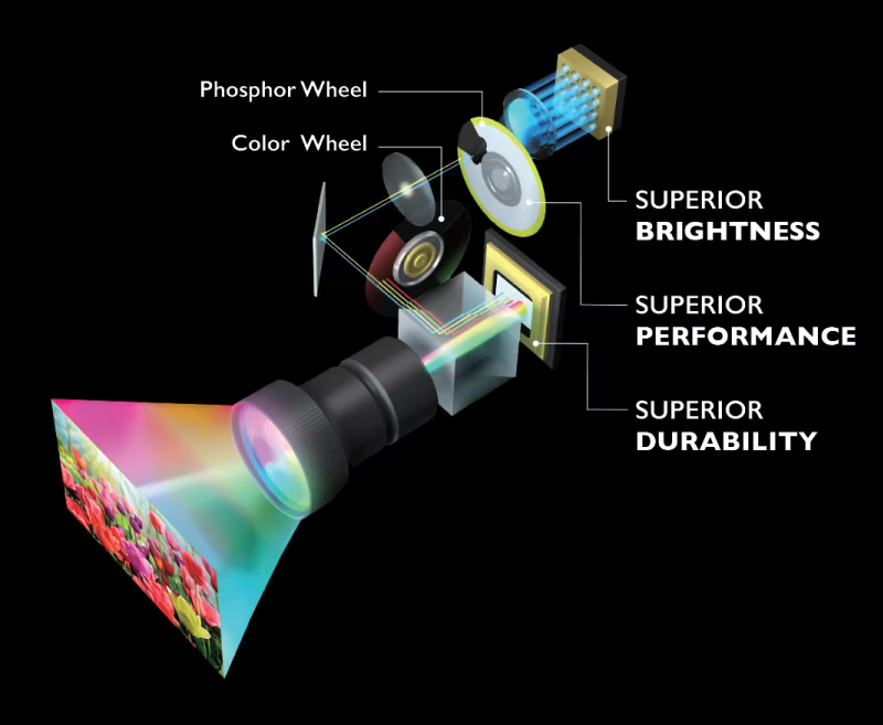 BenQ laser projectors are designed with sealed laser modules and enclosed light engines to protect the DMD chip, color wheel sensor, laser package, and other optical components. This lock-and-key design hermetically seals the engine from dust to prolong projector lifespan.