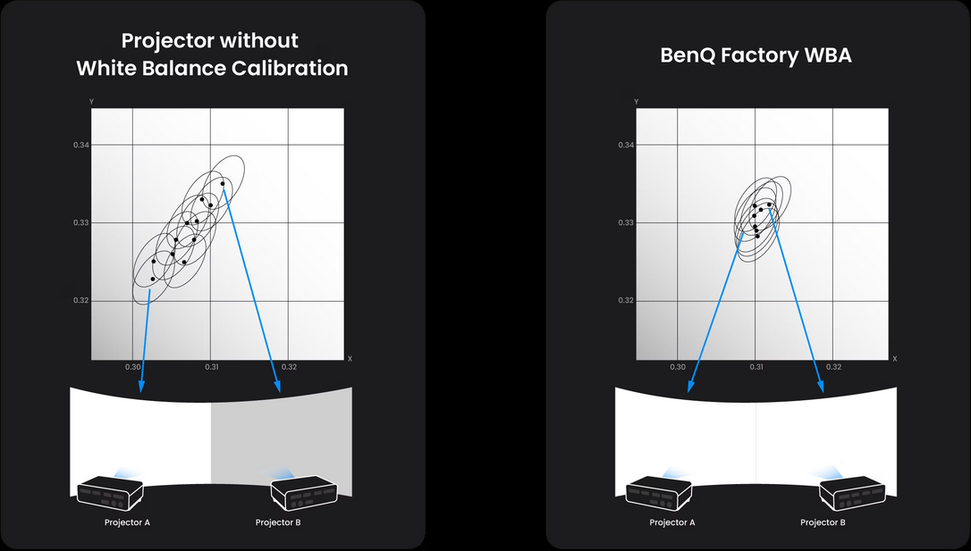 BenQ’s factory white balance adjustment (WBA) reduce variables between images projected from different projectors, significantly reducing manual calibration effort. It can save up to a full day of setup time in large-scale installations while ensuring seamless multi-projector alignment for edge blending.