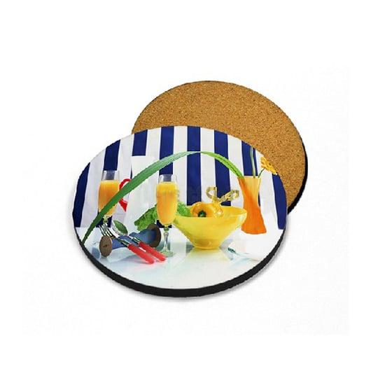 • Коркова подложка за чаши под формата на кръг, подходяща за персонализиране чрез сублимация.