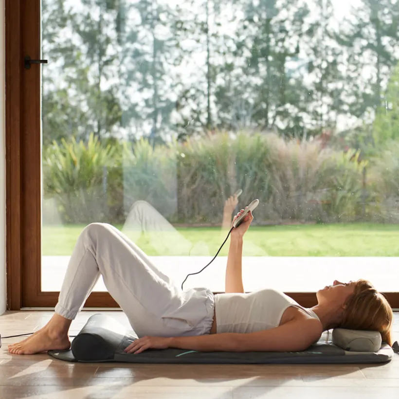 Stretching mat for stretching the muscles with inflatable air chambers, vibration & heat The stretching mat features air chambers which inflate in such a way that you experience yoga-inspired stretching for the shoulders, back and neck. The heat and vibration function can be individually switched on. Stay fit and increase your flexibility. | ![]() |