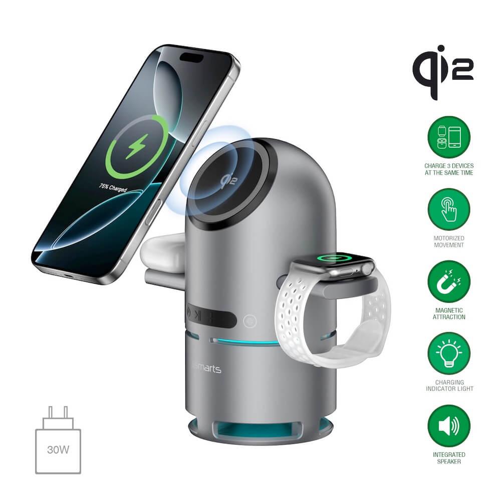 Безжичен спийкър с тройна поставка (пад) за безжично зареждане за iPhone с Magsafe и AirPods - 4smarts Qi2 ChargeBot Sound 3-in-1 Charging Station With Bluetooth Speaker (тъмносив)