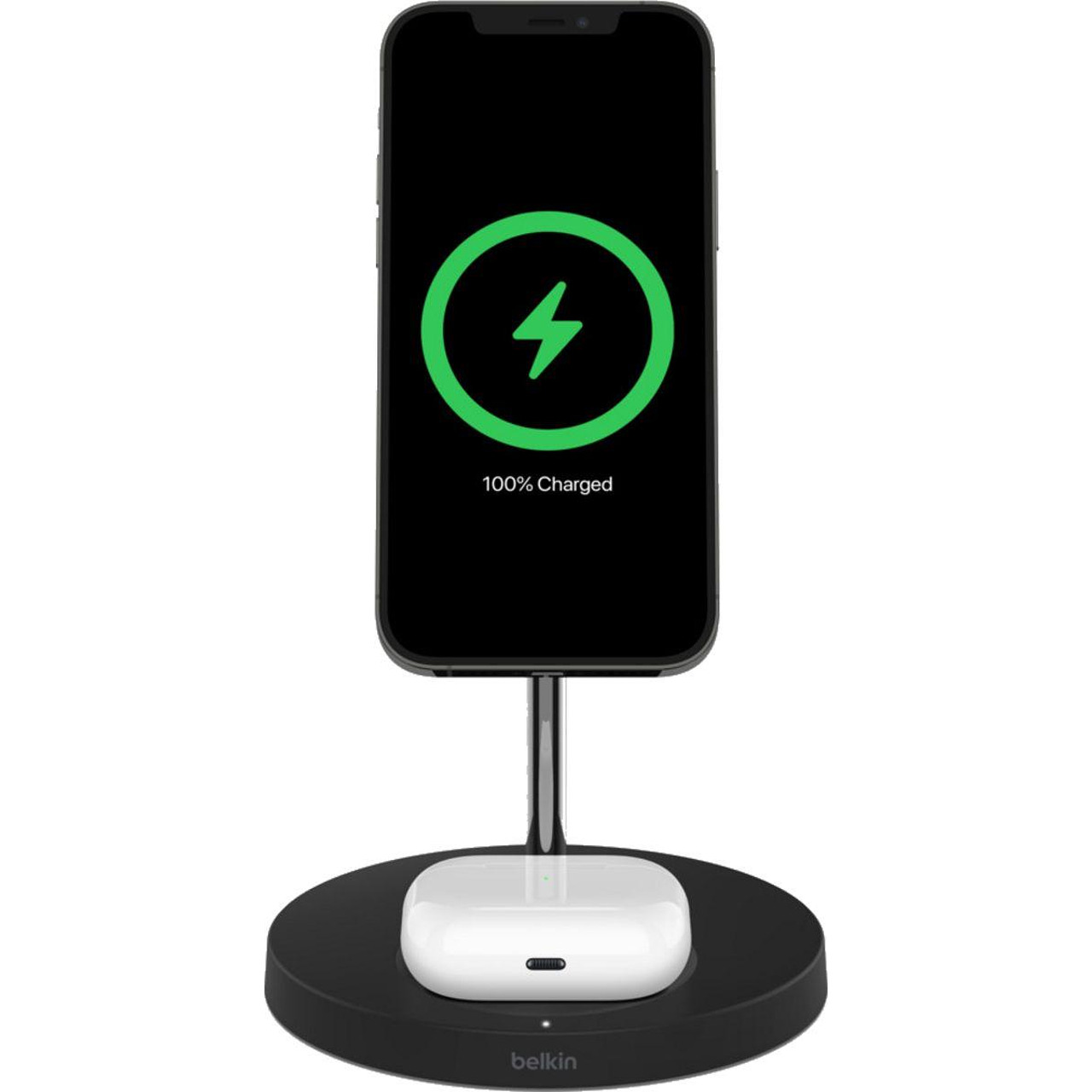 Заредете едновременно вашите iPhone и AirPods устройства с Belkin - MagSafe, сигурно и безжично. Мощната магнитна връзка осигурява безопасност и в портретна и в пейзажна ориентация. MagSafe е стандарт за безжичен трансфер на енергия от Apple, който позволява зареждане без кабели. Самата зарядна станция е свързана към електрическата мрежа.