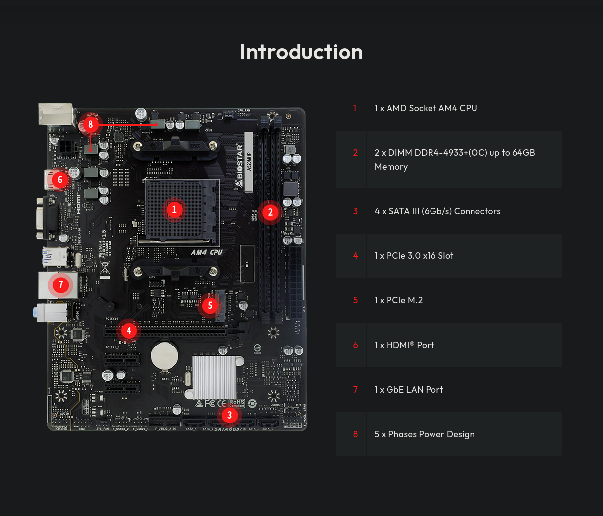 | CPU SUPPORT | Support AMD Ryzen 5000/5000G/4000G/3000/3000G series Processors Support for future AMD Ryzen processors with BIOS update * Please refer to www.biostar.com.tw for CPU support list. |