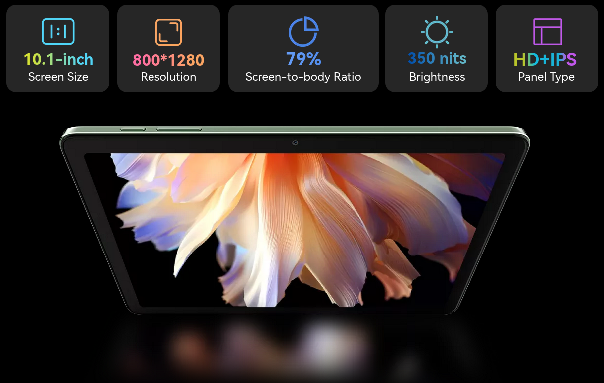 10.1-inch WXGA (800*1280 Resolution) IPS, 79% Screen-to-body Ratio, 60Hz Smart Refresh Rate