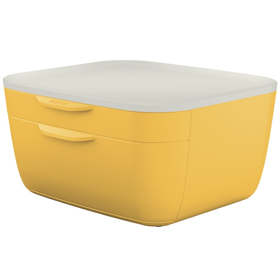 Бокс с чекмеджета Leitz Cosy – слънчевият акцент за подреден и вдъхновяващ офис!Поставете ред и цвят на бюрото си с бокс с 2 чекмеджета LEITZ Cosy! Със свежия си жълт цвят и стилния дизайн, този бокс не само организира вашите документи и принадлежности, но и носи доза оптимизъм във всеки работен ден. Изработен от висококачествен полистирен, той гарантира здравина и устойчивост, а компактните му размери (251x143x275 мм) го правят идеален за всяко бюро – от домашния офис до модерната работна среда. Продуктовата линия Cosy е създадена, за да вдъхновява и мотивира, превръщайки работното място в зона на креативност и продуктивност. С Leitz Cosy всичко е лесно подредено и винаги под ръка – защото когато цари ред, идва и вдъхновението!