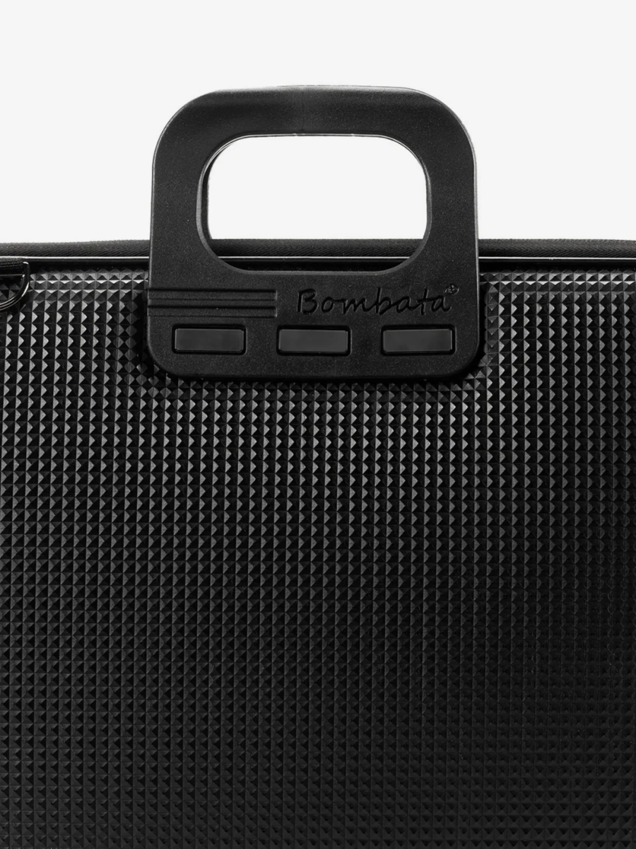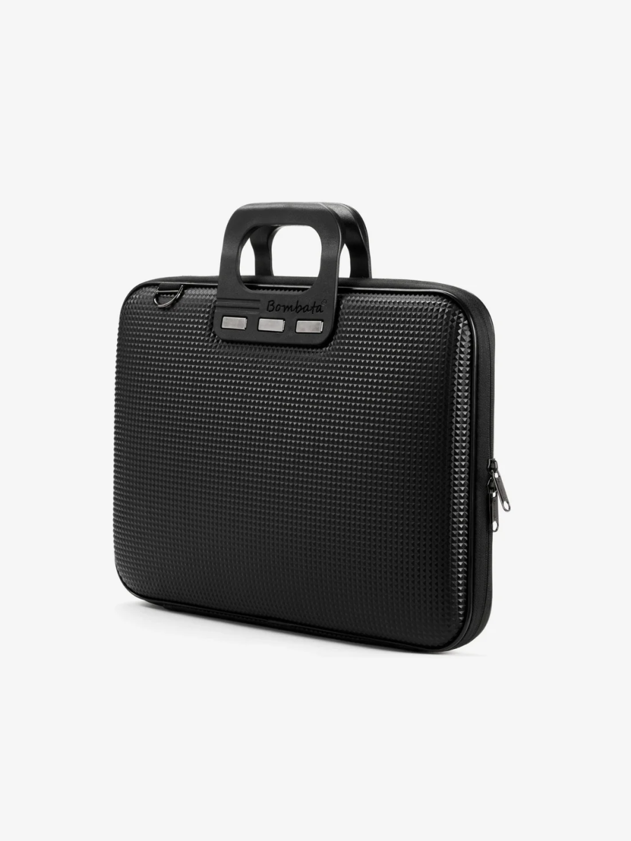 The Bombata Dark draws inspiration from gothic fashion, adapting it to the current modern context. It features small, embossed square studs on a rigid black material, like all the finishes. The Bombata Dark, a limited edition, offers three-dimensionality and durability for laptops up to 16".