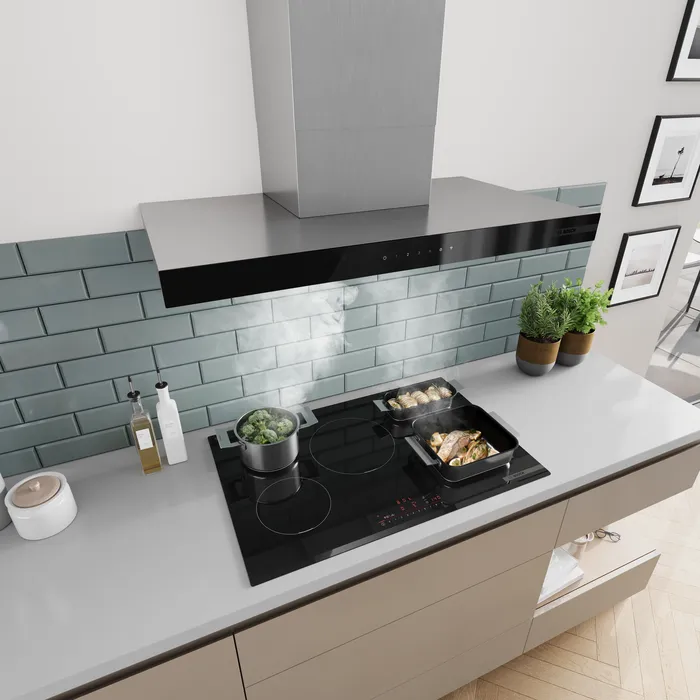 Наслаждавайте се на свеж въздух при готвене — дори в режим на рециркулация. Нашата двойна филтърна система ефективно премахва мазнини и миризми. Металният филтър улавя едри мазнини, а активният въглен се справя с по-фините мазнини и миризми. Bosch филтър с дълъг живот (артикул № DWZ1FB1B6) елиминира мазнините и миризмите, дори по-силни, като пържена риба. Може да се освежава три пъти и да издържи до четири години