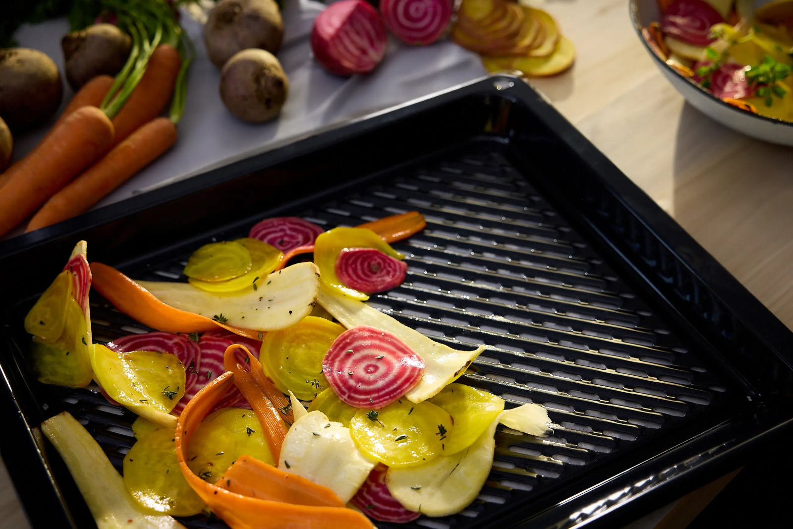 Защо да не си направите сами картофен чипс? Или пък чипс от пресни зеленчуци? Просто поставете нарязани на тънки филийки картофи или други зеленчуци върху тавата Air Frу and Grill, добавете малко олио, изберете функцията Air Fry и скоро ще похапвате удобно пред телевизора. А ето и още един съвет: можете да използвате тавата Air Fry and Grill и за приготвяне на ястия на скара.