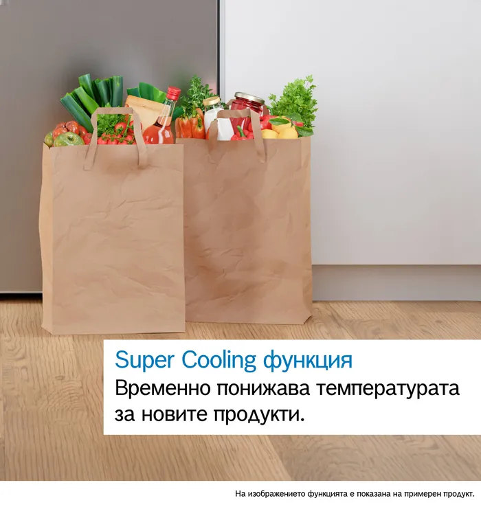 С функцията Super Cooling можете да понижите температурата в хладилника за кратко време преди да се отправите на пазар. Така свежите продукти ще се поддържат на идеалната температура. Просто натиснете бутона, за да намалите температурата с до 2°C. За да не се хаби излишна енергия, функцията автоматично се връща към нормалния режим след около 6-15 часа. Освен това, ако вашият уред е свързан, можете да настроите функцията Super Cooling чрез приложението Home Connect.