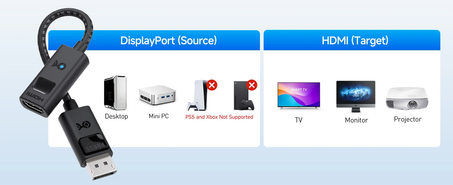 - Uni-Directional DisplayPort to HDMI: Step into the future of HDMI with the 8K DisplayPort to HDMI 2.1 adapter. The 8K DP to HDMI adapter connects a computer, laptop, or other source device with a DisplayPort connector to an HDMI TV or monitor—perfect for graphics cards with DisplayPort like NVIDIA RTX 4090 / RTX 4080 / RTX 4070 and AMD RX 7900 / RX 6900. (Note: Only works from DP (PC) to HDMI (display). Not compatible with PS5 or Xbox.)