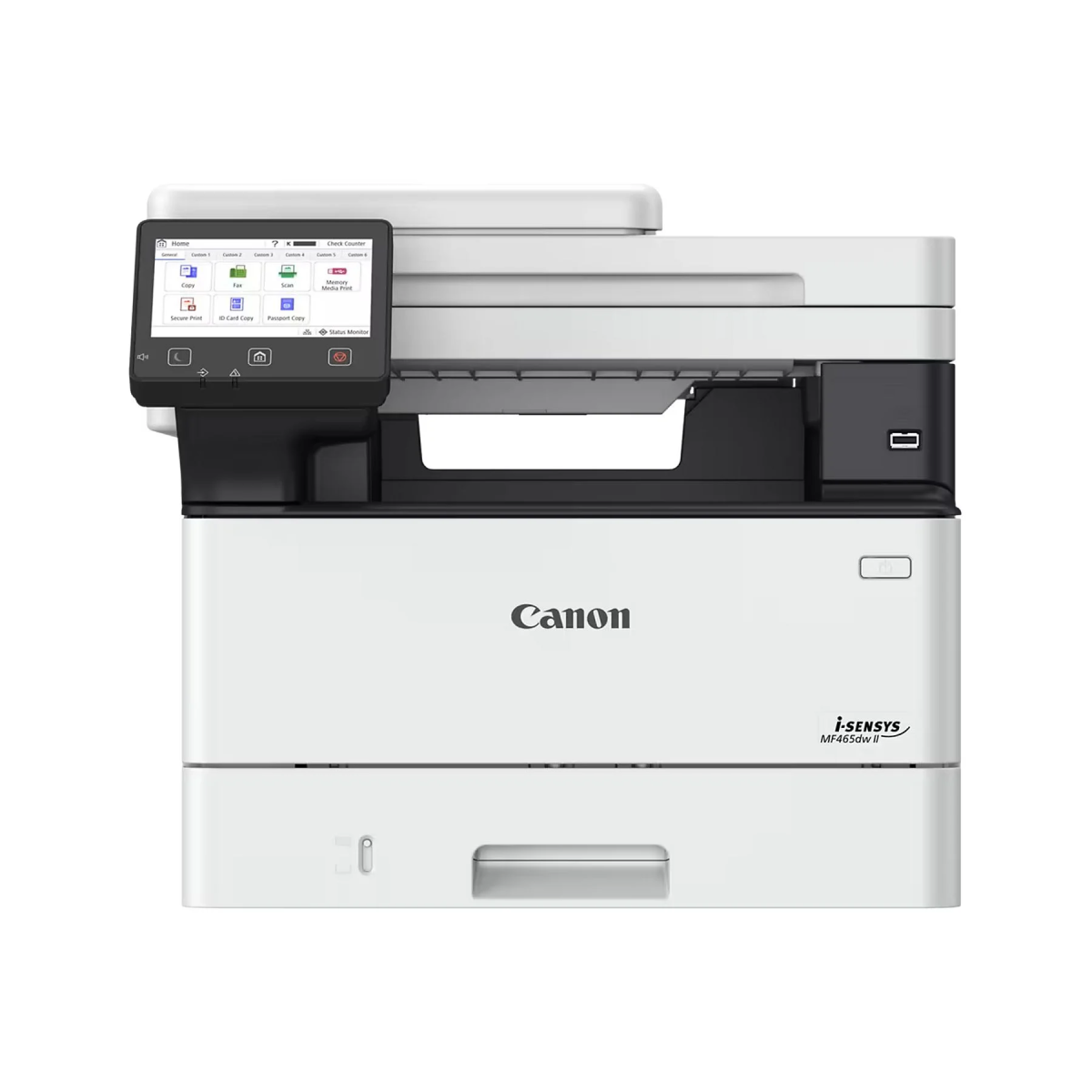 Canon i-SENSYS MF465dw II е монохромен лазерен мултифункционален принтер, който комбинира печат, копиране, сканиране и факс функции. Подходящ е за малки и средни офис среди, където се търси надеждност, добра скорост и модерни свързващи възможности. Специално той предлага до 40 стр./минута (A4) при печат, автоматичен двустранен печат, цветен сензорен панел и широка съвместимост с мобилно и облачно печатане.