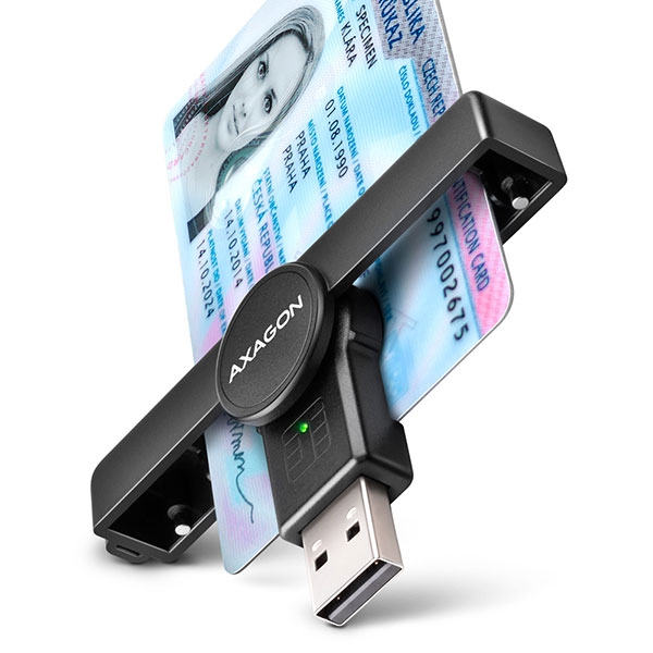 Foldable pocket Smart card / ID card reader AXAGON CRE-SMPA PocketReader with USB-A 480Mbps interface. It is especially suitable as an ID card reader for use with mobile phones that have an USB-A input. The most widely used USB-A connector ensures connectivity to almost every new and older computer.