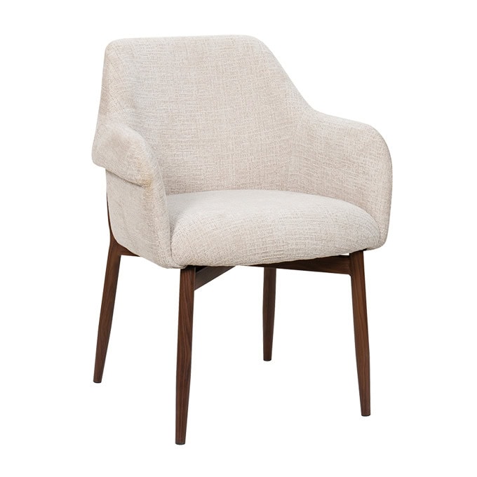 Трапезен стол BOLO съчетава удобство и стил с модерната си форма и подлакътници. Моделът е тапициран с мека дамаска, която придава уютен вид, а основата от праховобоядисан метал с дървесен ефект допълва дизайна със стабилност и елегантност. Столът е подходящ както за трапезария, така и за всекидневна зона за релакс.