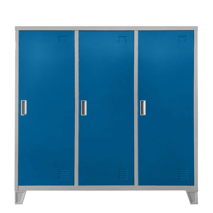 Метален шкаф Carmen CR-1605-3 JZ е троен метален гардероб с три плътни врати, които се затварят с помощта на магнитна система. Всяко отделение разполага с рафт с товароносимост до 40 кг, вграден лост за закачалки и вентилационен отвор за добра циркулация на въздуха. Моделът е снабден с крака с височина 10 см, които улесняват почистването под шкафа. Изработен е от праховобоядисан метал с грапаво-шагрен покритие. Подходящ е за оборудване на детски градини.