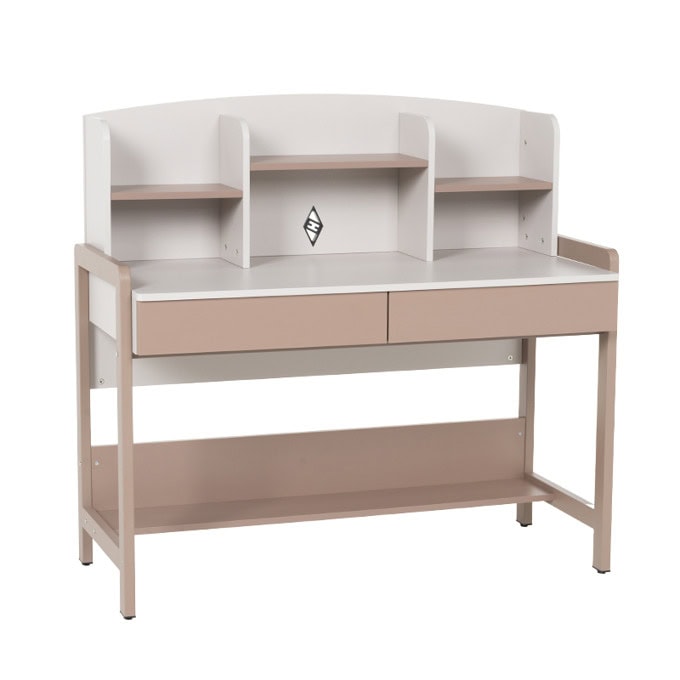 Впечатляващ модерен дизайн и практичност, съчетавайки две чекмеджета, странични декоративни панели и горна надстройка с рафтове за съхранение. Благодарение на металните си крака с прахово боядисано покритие и функционално разпределение, то е идеално решение за детска стая или домашен офис.
