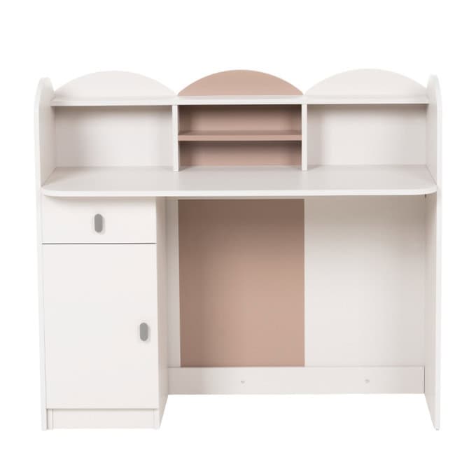 Бюро Pasig впечатлява с оригинален и заоблен дизайн, съчетаващ функционалност и нежна естетика, подходяща за детска или тийнейджърска стая. Множеството ниши и рафтове предлагат организирано пространство за книги, аксесоари или декоративни елементи. Шкафчето и чекмеджето с плавно затваряне улесняват подреждането на учебни пособия и лични вещи. Задната цветна панелна част придава завършен и хармоничен вид.