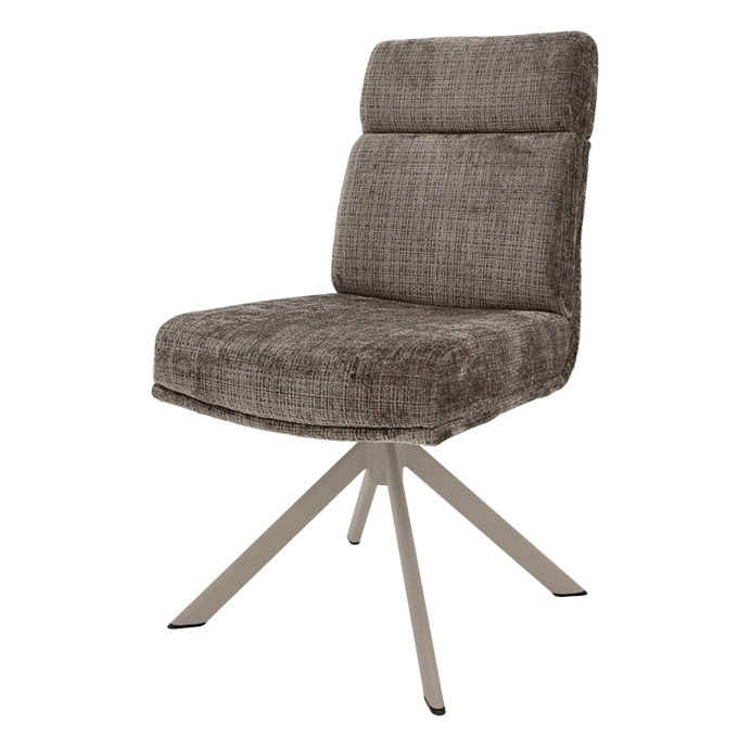 Трапезен стол TURI впечатлява с модерен силует и изключително комфортна седалка от мека дамаска с покет пружини. Основата от праховобоядисан метал в елегантен крем-перла цвят придава лек и изискан характер. Моделът разполага с 360° въртене, автоматично връщане в изходна позиция и дискретна люлееща функция, осигуряващи допълнителна свобода и удобство при сядане.