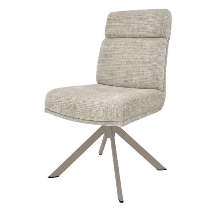 Трапезен стол TURI впечатлява с модерен силует и изключително комфортна седалка от мека дамаска с покет пружини. Основата от праховобоядисан метал в елегантен крем-перла цвят придава лек и изискан характер. Моделът разполага с 360° въртене, автоматично връщане в изходна позиция и дискретна люлееща функция, осигуряващи допълнителна свобода и удобство при сядане.