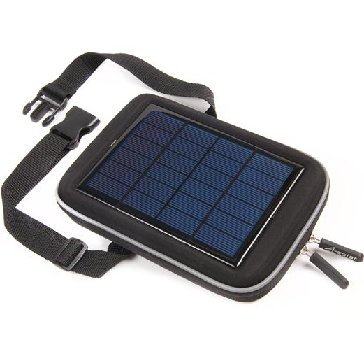 Чанта със соларнен панел и външна батерия за мобилни устройства, която може да бъде зареждана от слънцето, от ел. мрежа или компютър