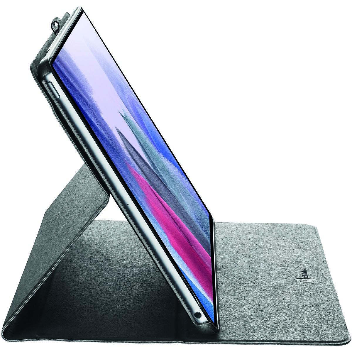 Черен Folio калъф Samsung Galaxy Tab A9 е с полутвърда задна обвивка, която защитава ъглите, и преден капак, изработен от изкуствена кожа за защита на дисплея на таблета ви. Лесен за сгъване, калъфът се превръща в удобна стойка с три различни нива на накланяне за писане, провеждане на разговори, гледане на филми и сърфиране в интернет.
