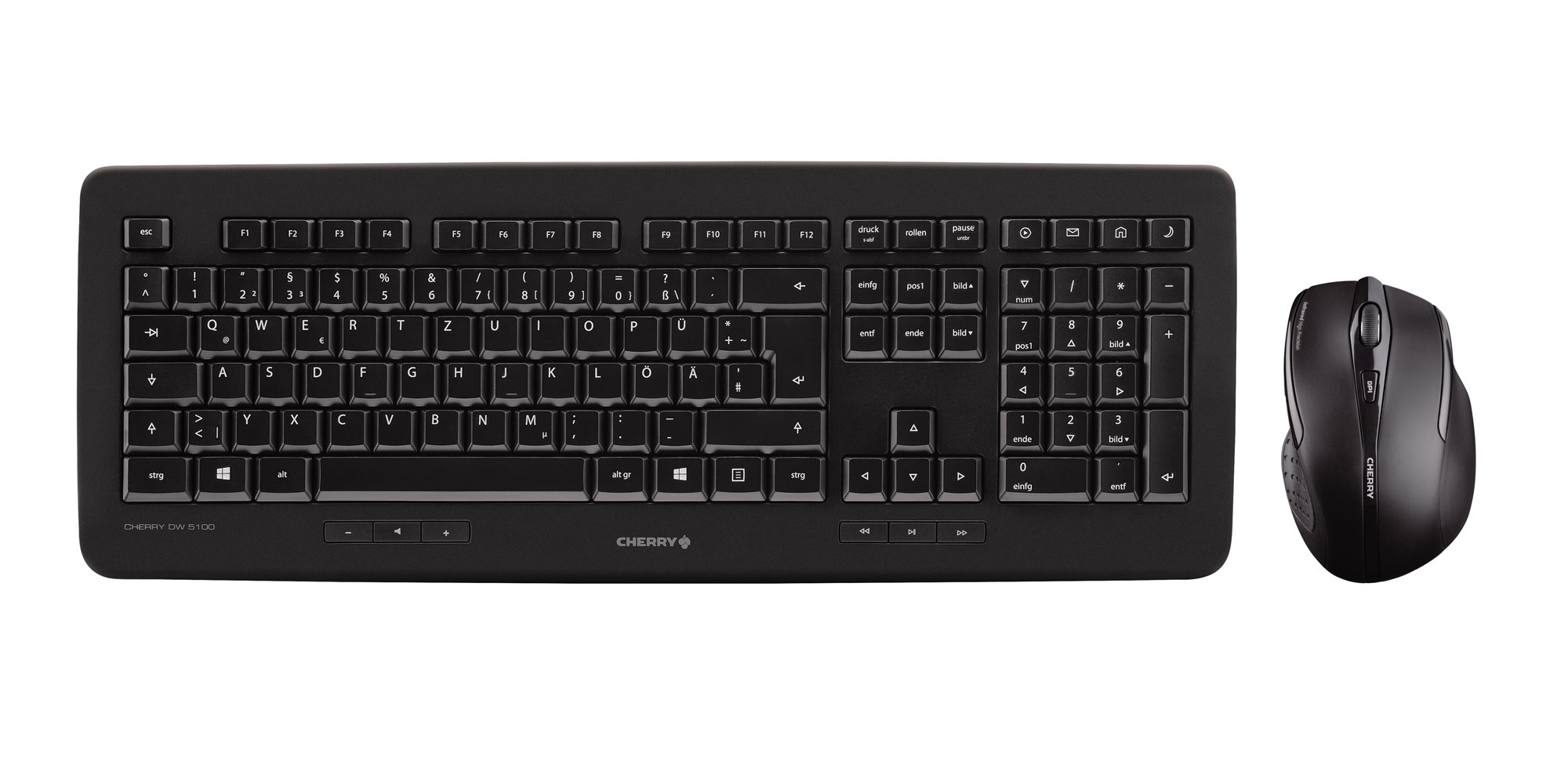 CHERRY DW 5100. Keyboard form factor: Full-size (100%). Keyboard style: Straight. Connectivity technology: Wireless, Device interface: RF Wireless, Keyboard layout: QWERTZ, Keyboard number of keys: 115, Recommended usage: Universal. Product colour: Black. Mouse included