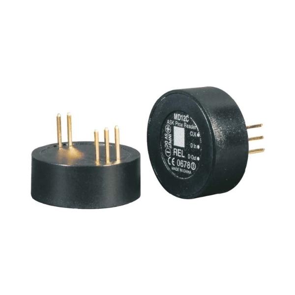 MD-12W е ултраминиатюрeн OEM proximity четец, предназначен за директен монтаж върху печатни платки. С диаметър само 22 мм и дебелина 9.5 мм той е най-компактният RFID модул на пазара, използващ 26-битовия Wiegand протокол. Работи от 4.5 до 5 V DC и черпи едва 36 mA в Standy режим, като може да чете стандартни 125 kHz proximity карти на разстояние до 50 мм. Модулът използва ASK модулация и е проектиран да функционира при температури от – 31 °C до + 63 °C и влажност до 95 %. MD-12W тежи едва 5 г, което го прави идеален избор за вграждане в индустриални и търговски устройства, където мястото и енергийната ефективност са от критично значение.