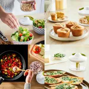 ![]() | Бързо & лесно рязане Бързо & Лесно: поставете острието. Добавете съставките. Затворете капака. Дръпнете дръжката... Един, два, три пъти. Колкото повече дърпате, толкова по-фино режете! |