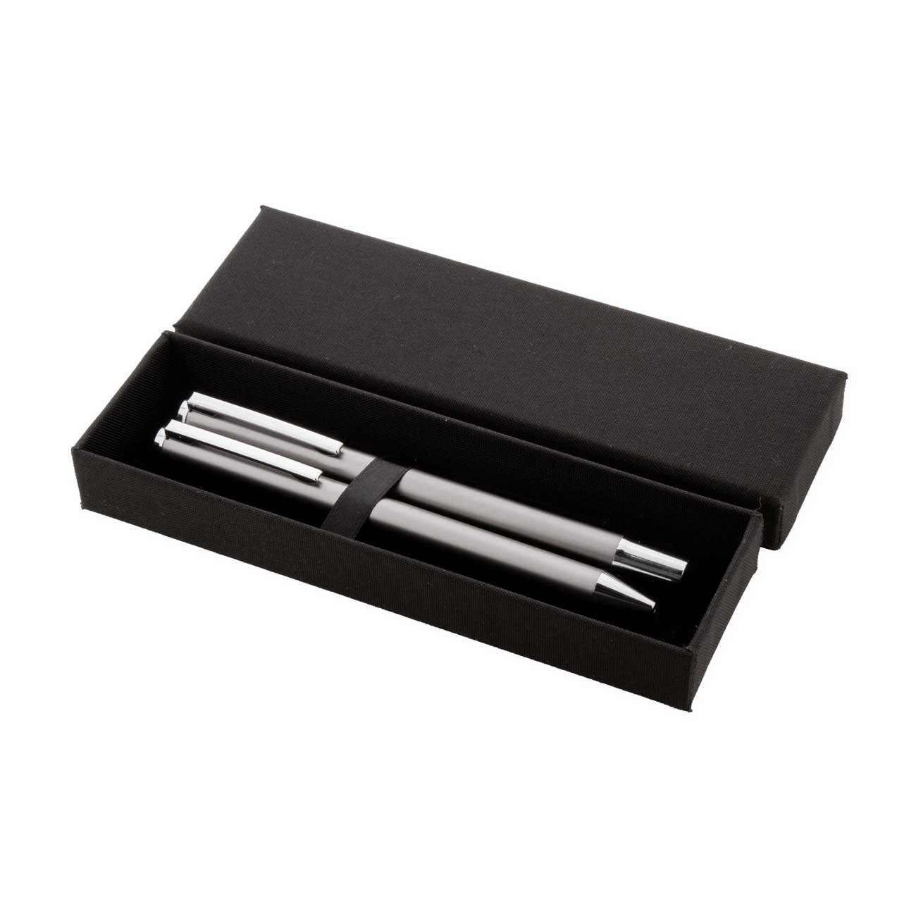 Комплект химикалка и ролер Ralum от рециклиран алуминий в черна хартиена подаръчна кутия.
