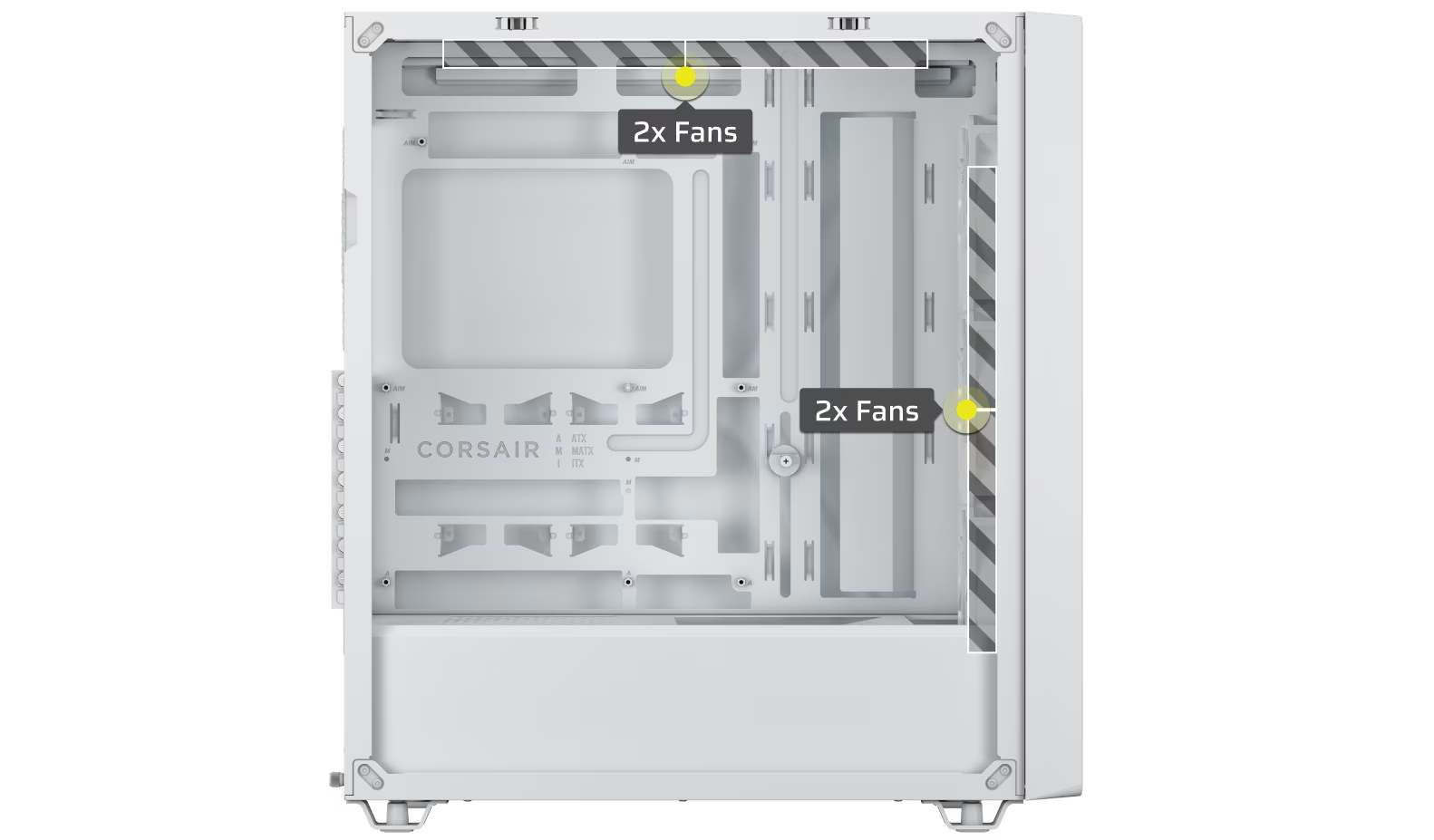 The CORSAIR 3200D is made to keep the hottest components cool with 2x 360mm radiator mounting locations and fan mounts throughout the chassis for continuous airflow.