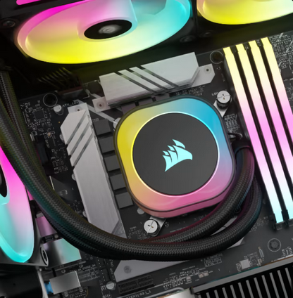 Keep noise down Enjoy ultra-quiet performance under any conditions with auto-adjusting pump speeds, precisely controlled by iCUE software. | Your setup at your command Adjust fan and pump speeds, control and synchronize RGB lighting, and monitor CPU and coolant temperatures in iCUE. |