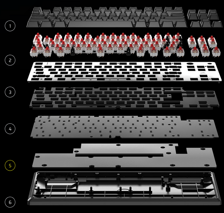 | 4. PCB | 5. Sound Dampening Layer #2 | 6. Bottom case |