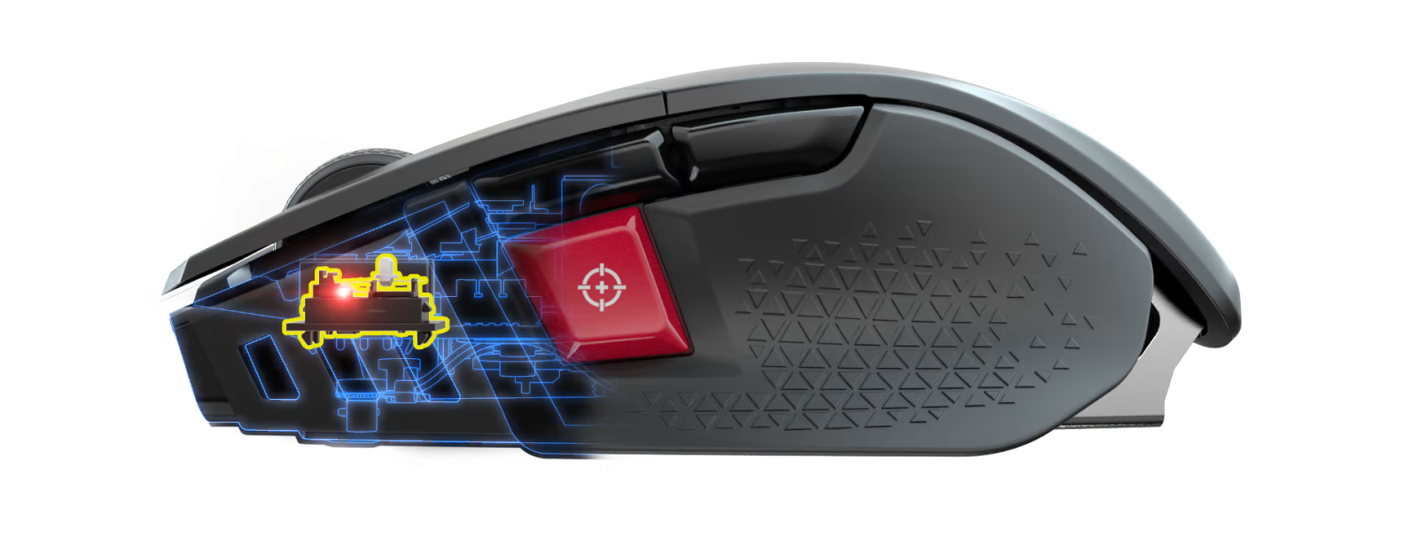 Shorter travel means quicker clicks, which is why the M65 RGB ULTRA WIRELESS is equipped with patent-pending CORSAIR QUICKSTRIKE buttons. The spring-loaded design delivers zero gap between the primary mouse buttons and their optical switches, ensuring superb speed, responsiveness, and consistency.