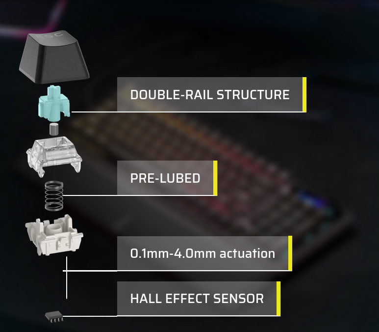 Rapid trigger Win with the power of magnets! MGX Hyperdrive switches can have dynamically resetting actuation points, enabling rapid taps that don't need the keyswitch to physically reset. | ![]() |