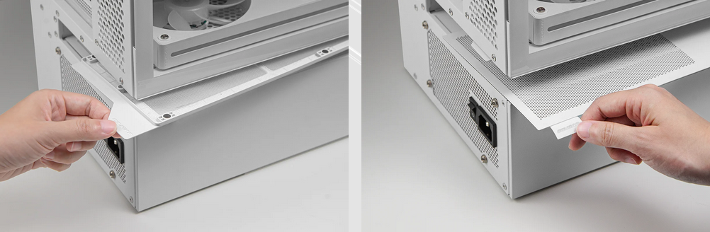 Dust filters attach magnetically to protect the separated PSU cabin and main chamber from dust and other particles. | Just grab the protruding tag and pull: it’s that easy to clean the filter. |