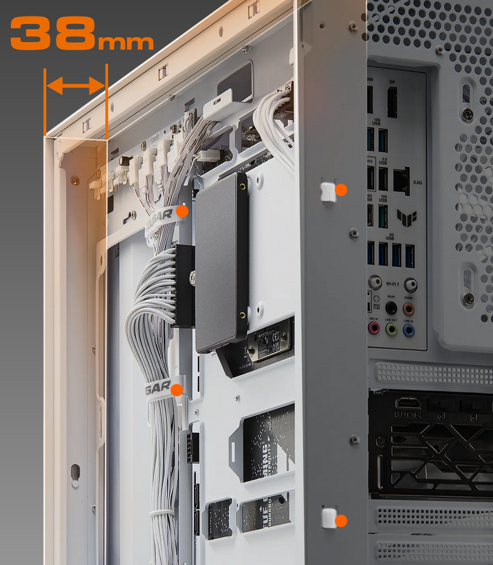 Space Engineering 38mm of clearance behind the motherboard tray improves cable management ,offering more room to route and conceal cables of varying thickness. Five adjustable Velcro straps offer versatile options to secure and tidy your layout. | ![]() |