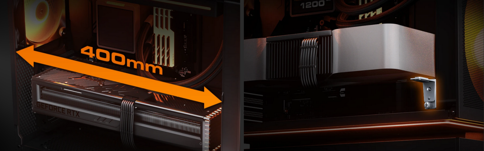 Compatible with reverse connector motherboards and accommodating GPUs of up to 400mm, the CFV235 Mesh is engineered for the gaming rigs of the future. A cover pulls triple duty as airflow guide, cable management facilitator and GPU holder which can be optimally placed according to motherboard specifications: this makes the most efficient use of available space by not only reducing cable clutter but improving performance stability.
