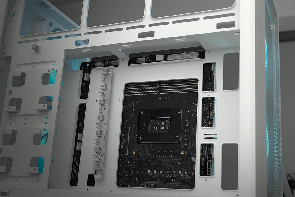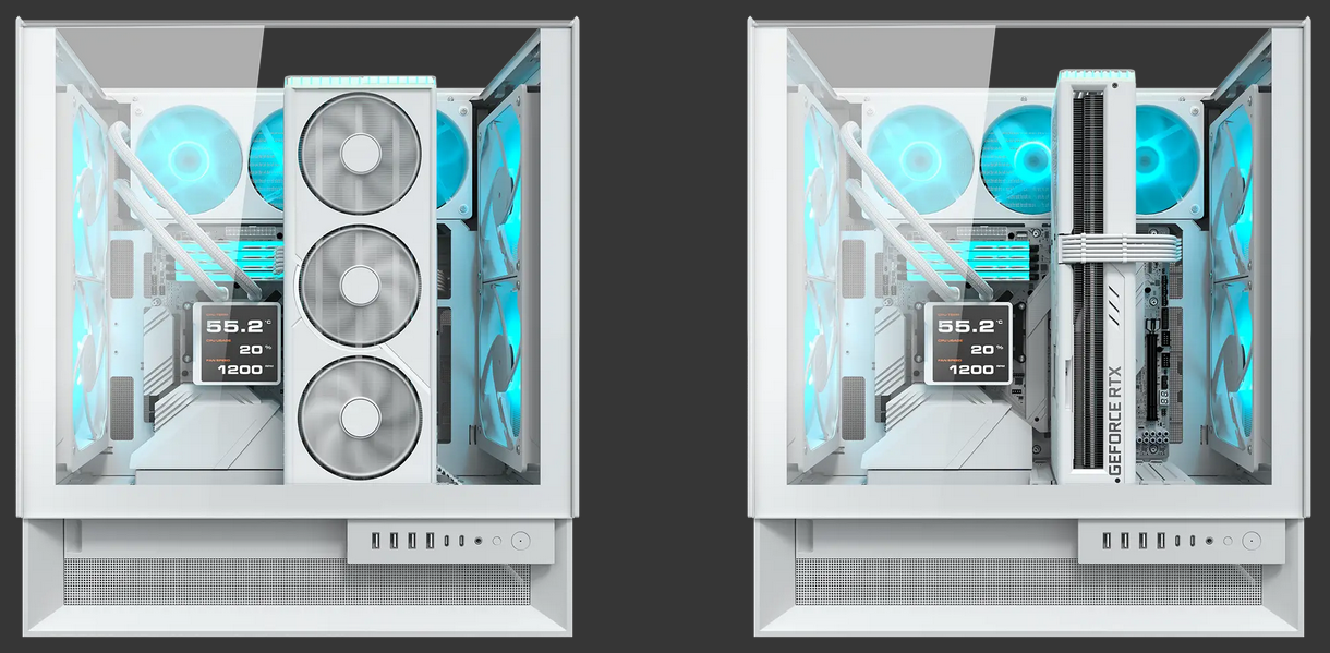 A perfectly symmetrical design makes for complete freedom of orientation. With dual transparent glass panels putting your build on display from any angle, the OmnyX looks stunning whether it’s placed on the right, left, or center.