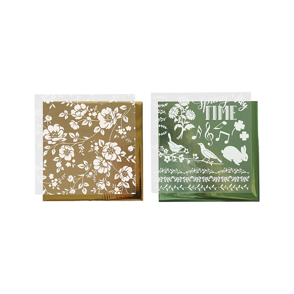 • Опаковка с 2 различни цвята (зелен и златен) деко фолио и 2 прехвърлящи листа.
