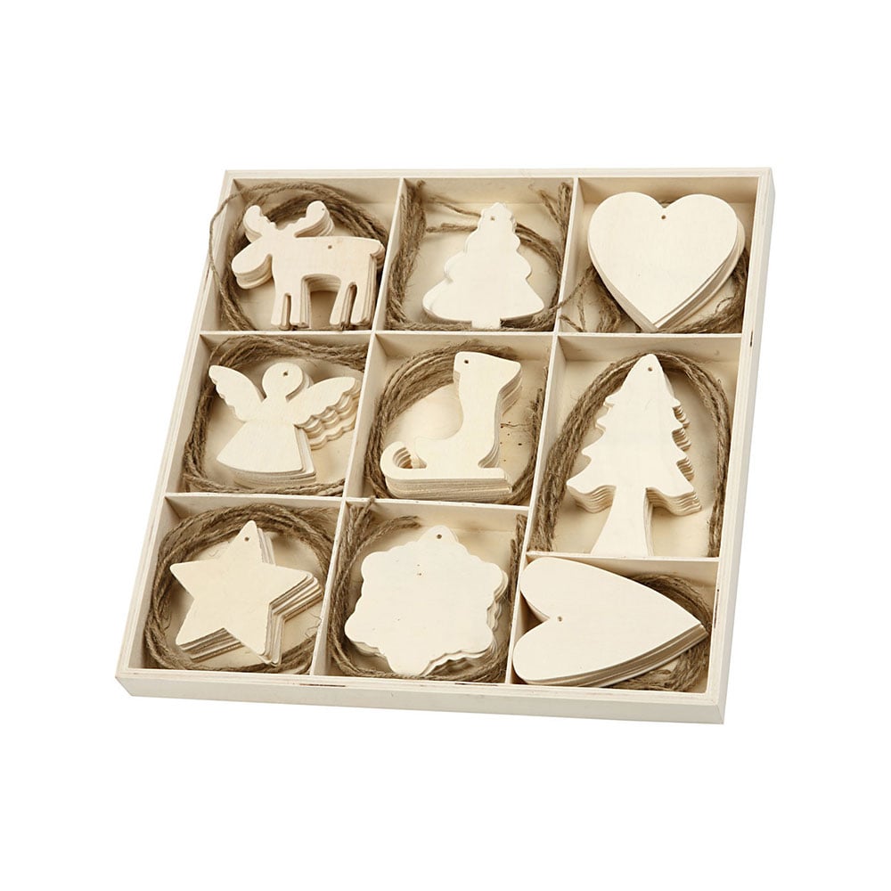 Коледни орнаменти от светло дърво с окачена връв и дървено мънисто.