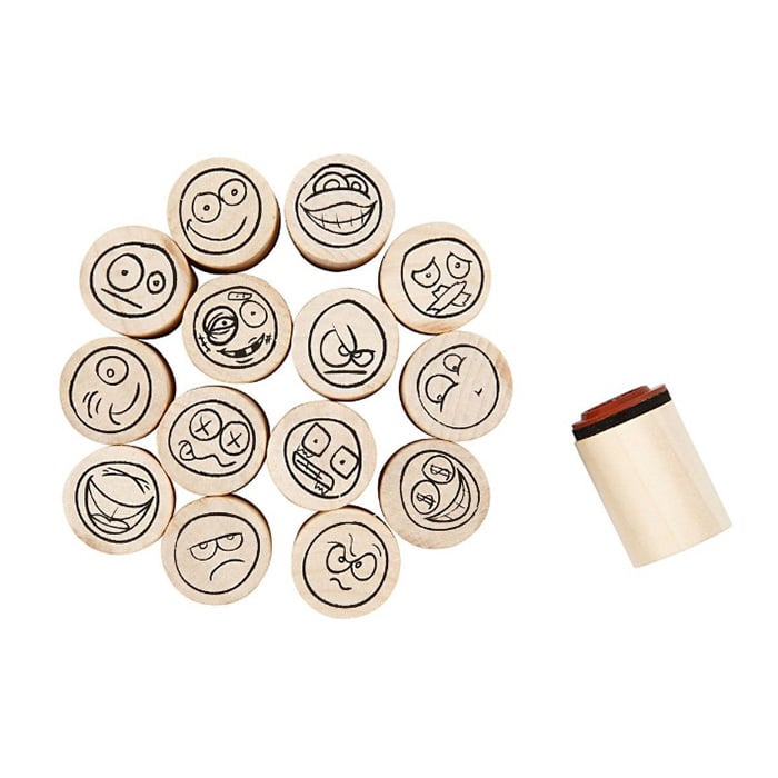 • 15 броя дървени печати с различни емоции.