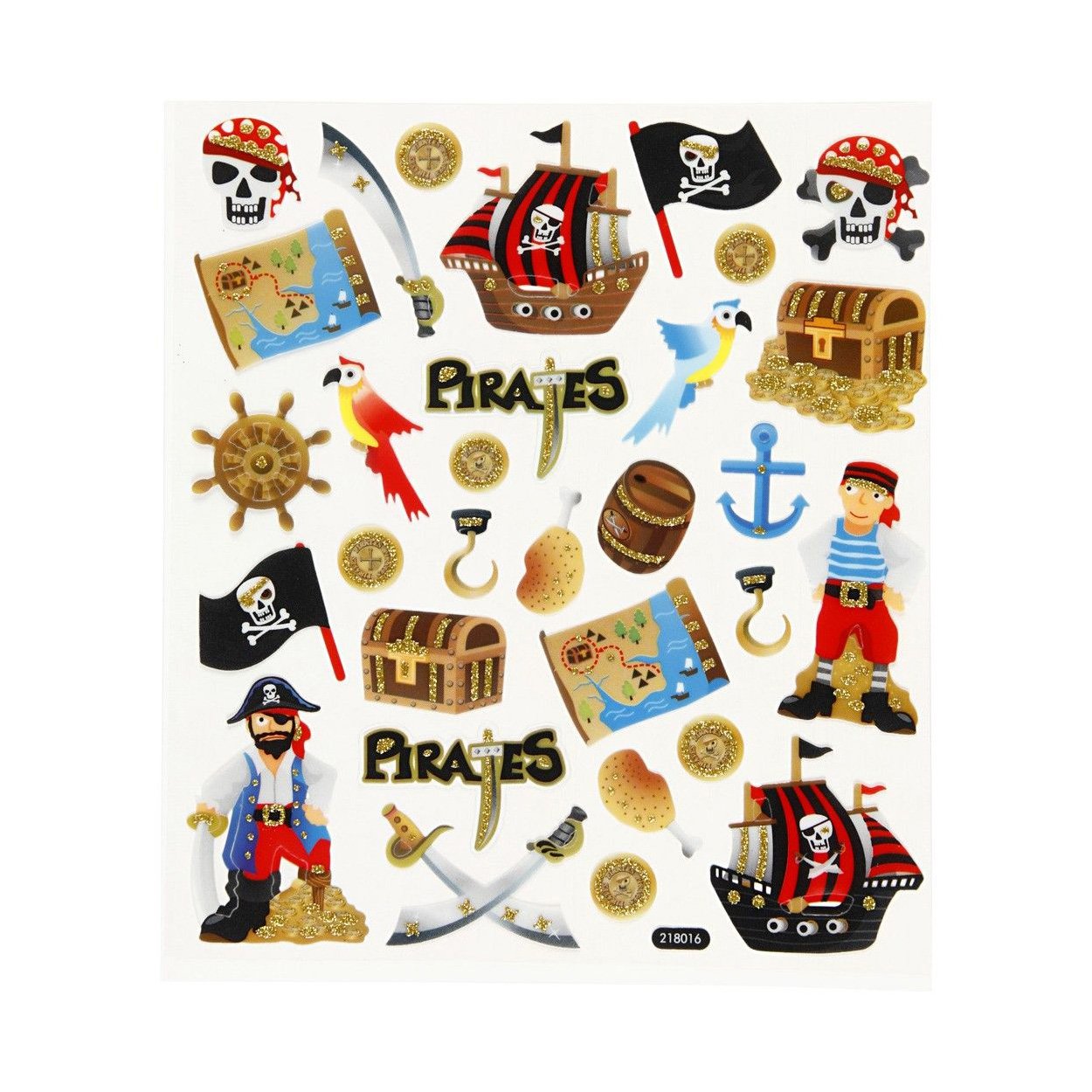 • Самозалепващи стикери от тънко прозрачно фолио с метални ефекти.Мотив - пирати. Брокатен ефект. Картинките изобилстват от цветове и ще персонализират всичко, до което се докоснат. Залепени, те няма да изгубят плътния си цвят, а напротив – ще дават контраст и настроение.