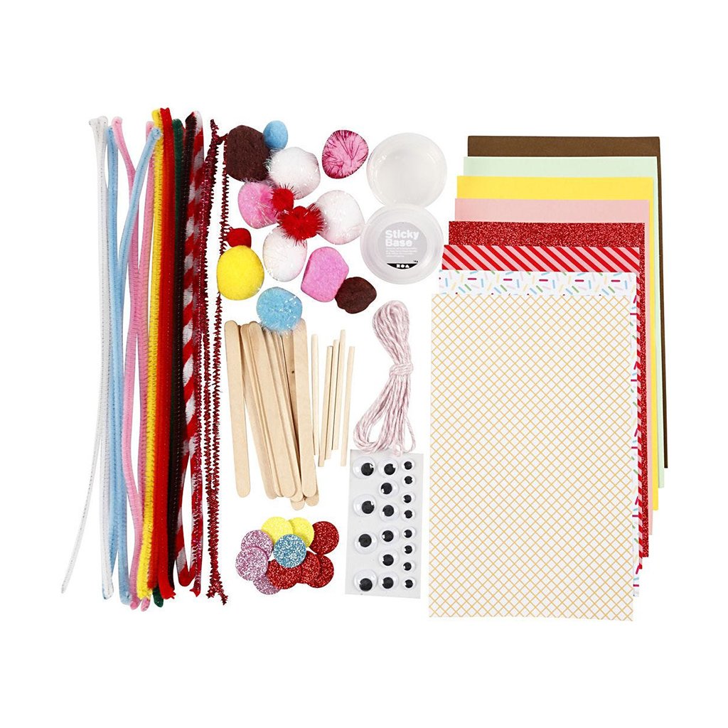 • Съдържание: декоративна хартия с различни шарки, едноцветна хартия в няколко цвята, лепкава база, брокатена хартия, лепящи мърдащи очички, дървени пръчки в два размера, памучна връзка, блестящи топчета и предложения за ръчно изработени проекти.