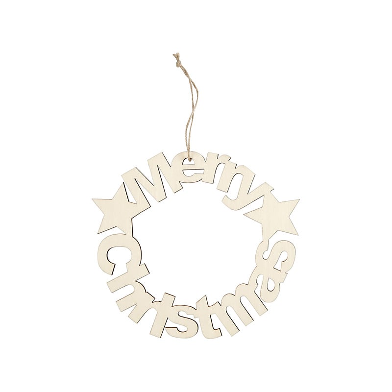 Коледен венец, изработен от дърво с тъмни ръбове и връв за окачване.