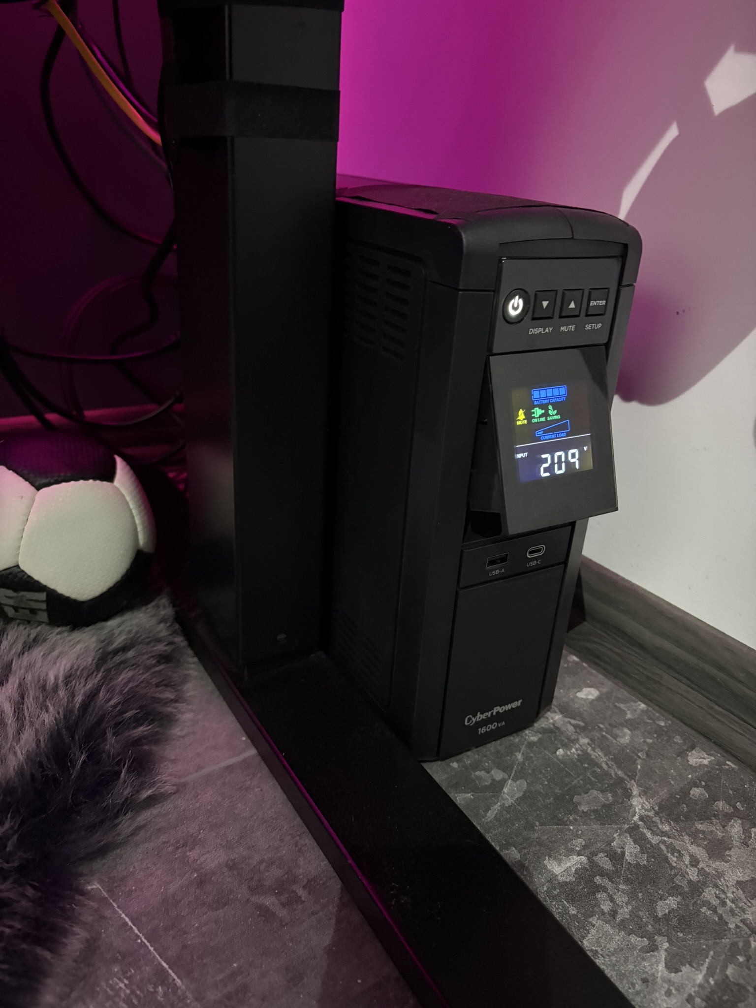 CyberPower CP1600EPFCLCD with Pure Sine Wave output safeguards mid- to high-end computer systems, servers and networking hardware that use conventional and Active Power Factor Correction (PFC) power supplies. Designed with GreenPower UPS™ Technology to improve UPS operating efficiency and to minimize its energy consumption, this UPS delivers significant energy cost savings over conventional UPS systems. The UPS provides Automatic Voltage Regulation (AVR) to maintain stable voltage for connected equipment. The product features data line protection with high-speed transmission to safeguard communication equipment against surges/spikes as well as supply 1Gbps speed to transmit data. With tiltable color LCD panel , users can monitor key power and battery information at a glance. The PowerPanel Power Management Software allows user to perform real-time monitoring and configuration.