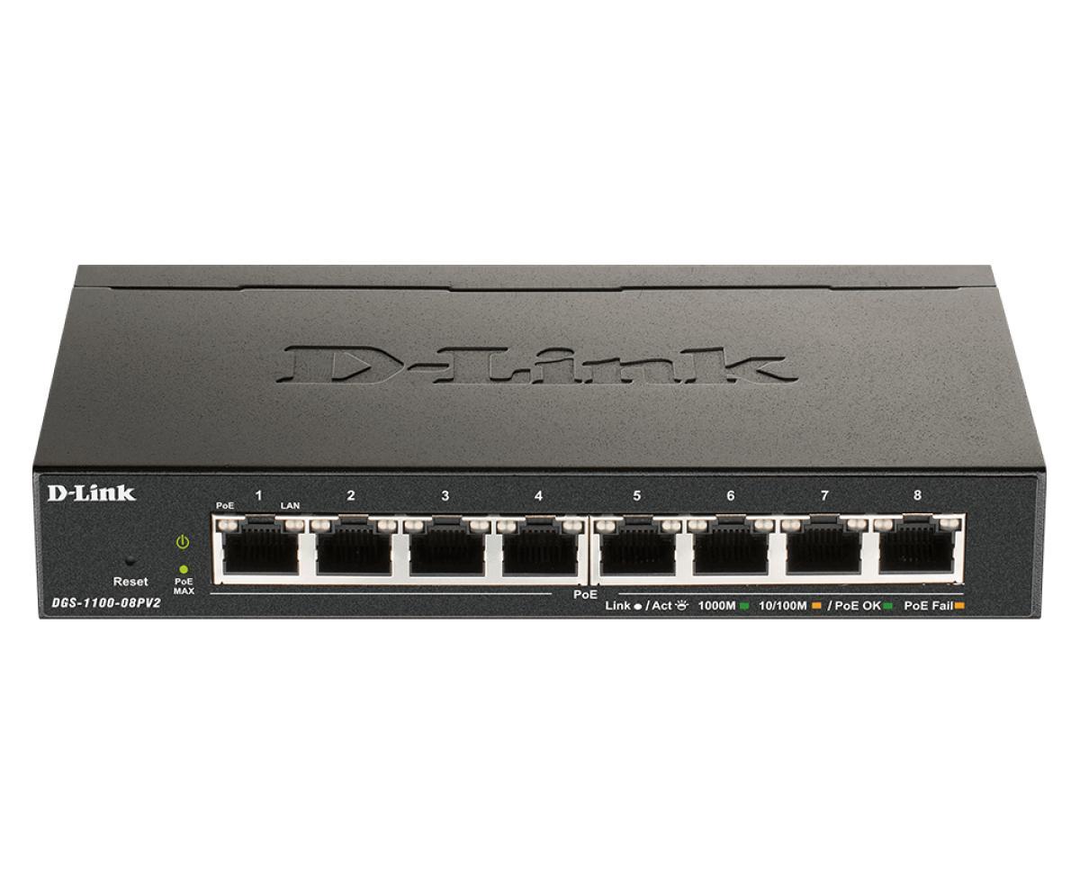 Powerful and flexible networking solution for small, medium, and enterprise businesses. Simple. Easy. SmartWebUI Web UIEasy to use web interface to access management features.Static Routing VLANsSegment your network into VLANs.Surveillance mode Surveillance Mode InterfaceGet a snapshot of your security topology in an instant.Advanced Security FeaturesThe DGS-1100 series’ web user interface gives administrators an easy way to manage Layer 2 features, such as VLANs, Spanning Tree Protocol (STP), and link aggregation (desktop models utilize Static Trunk). With powerful security features including IGMP snooping, Static MAC, and Storm Control, these smart managed switches are a versatile solution for deployments that require easy to configure functionality without added complexities.Simplify Network ManagementD-Link’s free Network Assistant (DNA) utility displays all your connected devices and makes first-time configuration a breeze. The free D-View 7 Network Management System comes with a license for 25 nodes and 2 probes and full access to the management tools.Full PoE SupportThe DGS-1100-08PV2 supports IEEE 802.3af/at Power over Ethernet on all eight copper access ports. Power over Ethernet greatly simplifies the installation of PoE-enabled devices such as VoIP phones and IP cameras in remote locations with no immediate access to a power outlet. Each individual port has capacity to support up to 30W of PoE power, while the switch has an overall budget of 64W.Easy TroubleshootingThe DGS-1100 Series features Loopback Detection and Cable Diagnostics to help network administrators find and solve network problems quickly and easily.Loopback Detection detects loops created by a specific port and automatically shuts down the affected port. The Cable Diagnostics feature is designed for network administrators to quickly examine the quality of the copper cables, recognize the cable type, and detect cable errors.Green TechnologyD-Link Green technology enables the DGS-1100 Smart Managed Switches to save power without sacrificing performance. The desktop models in the series utilize a fanless design, for silent and energy-efficient operation. All models are also IEEE 802.3az-compliant and feature Link Status detection.